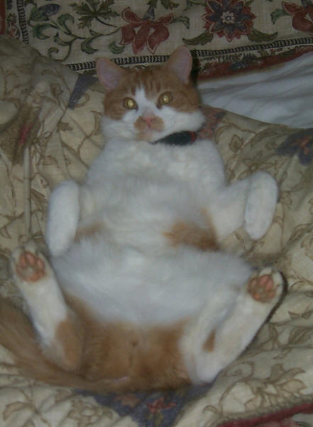 Lazzzy Casper cat on bed at pub. Did he run off or did someone take him?